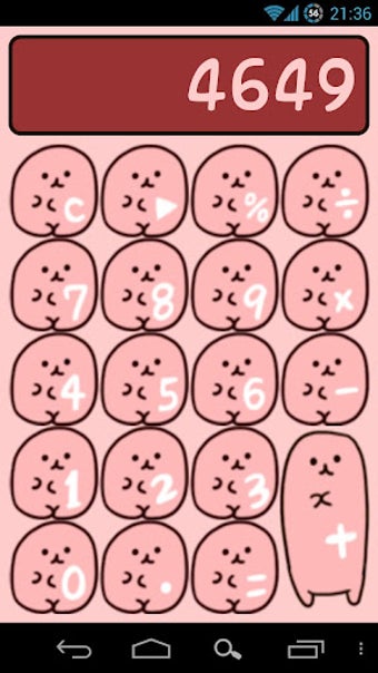 もふ電卓を開くと、通常の電卓のようにボタンが並んでいますが、それぞれのボタンが丸い可愛いキャラクターで表示されています。1~9の数字ボタンをタップすると「ニャー」と鳴きながらバンザイをします。その他の「+」や「=」などの記号をタップすると、バンザイする動作は数字と同じですが「ピッ」という音を発するので、目にも耳にもキャラの可愛さが伝わり、癒されます。